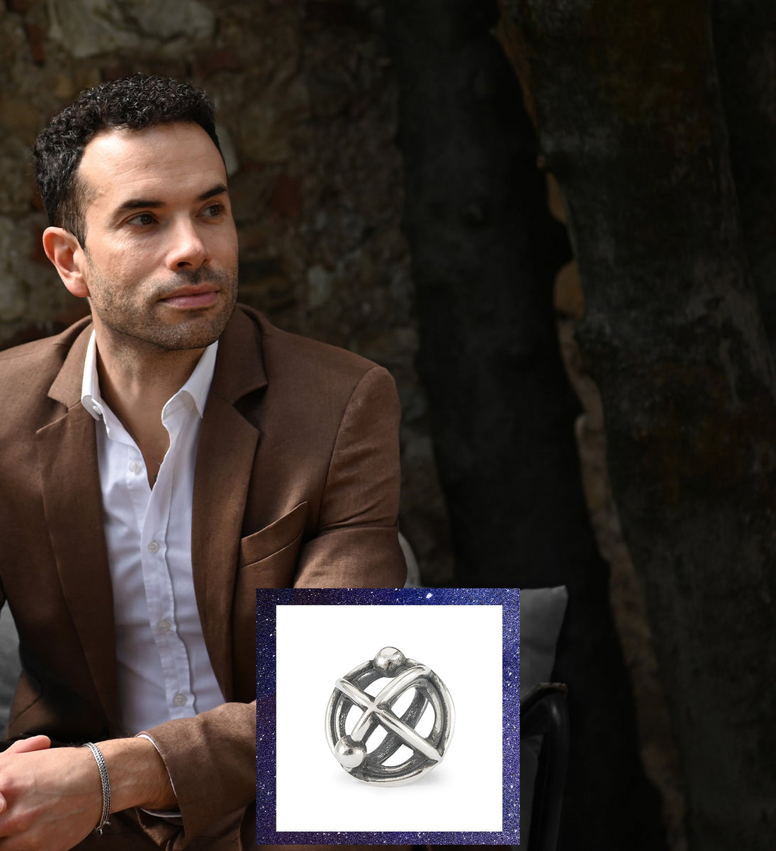 Model with blue shirt wears sparkling christmas bracelets and silver ring with bead