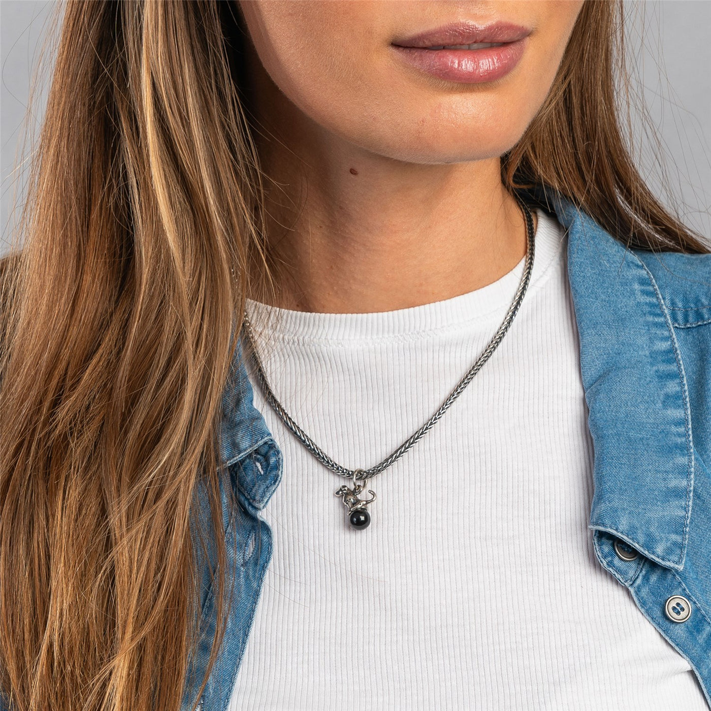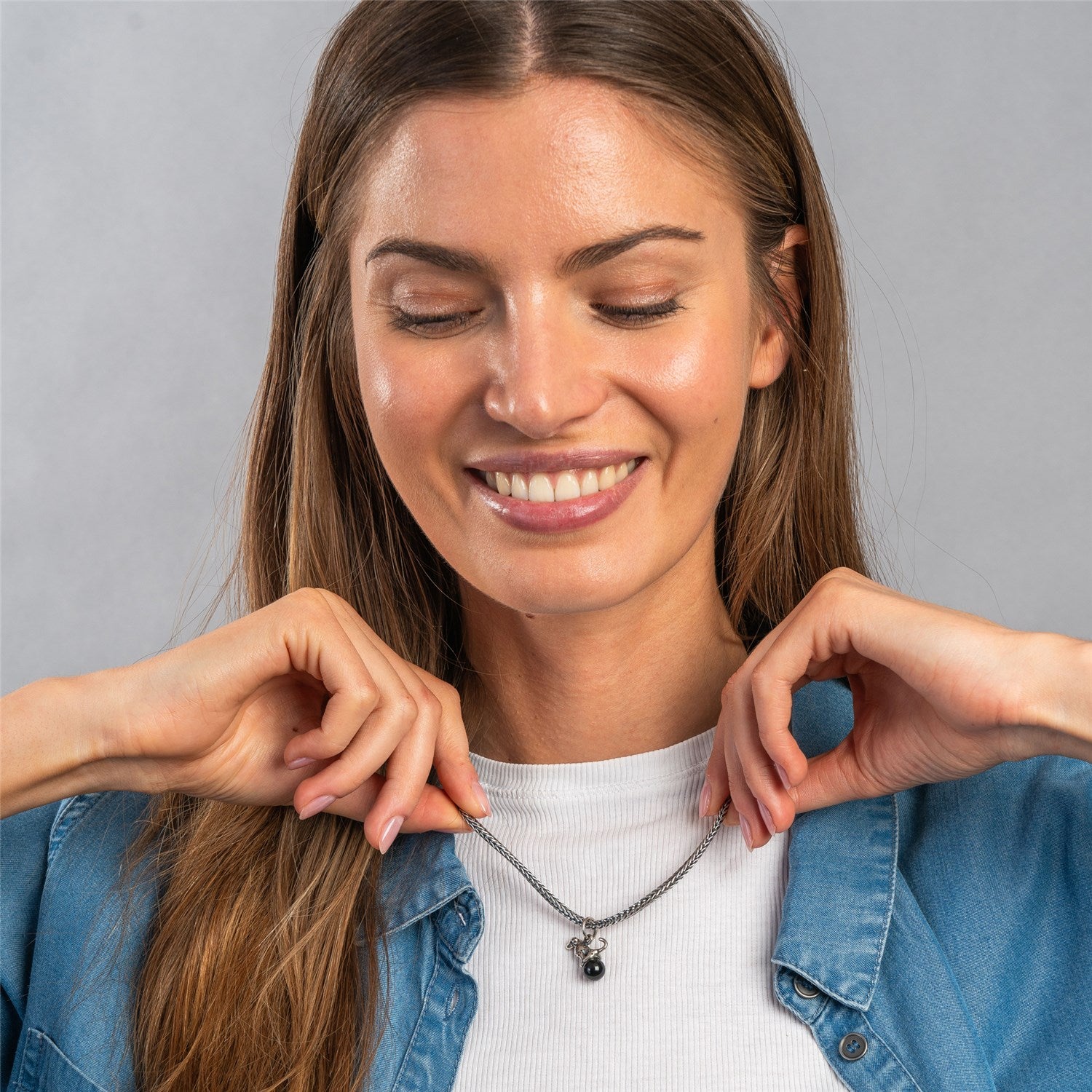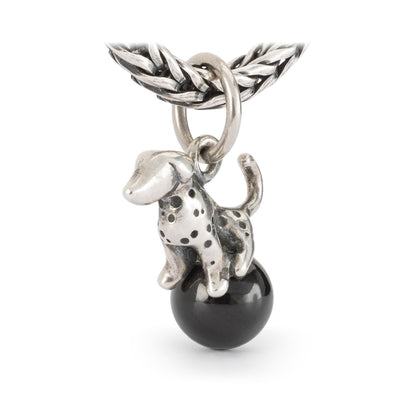 Jewellery silver pendant of a dalmation dog on a ball of Black Onyx gemstone.
