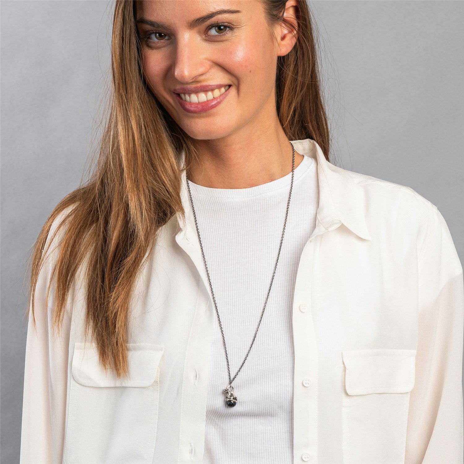 Jewellery silver cat pendant sitting on a ball of Blue Tiger Eye gemstone.