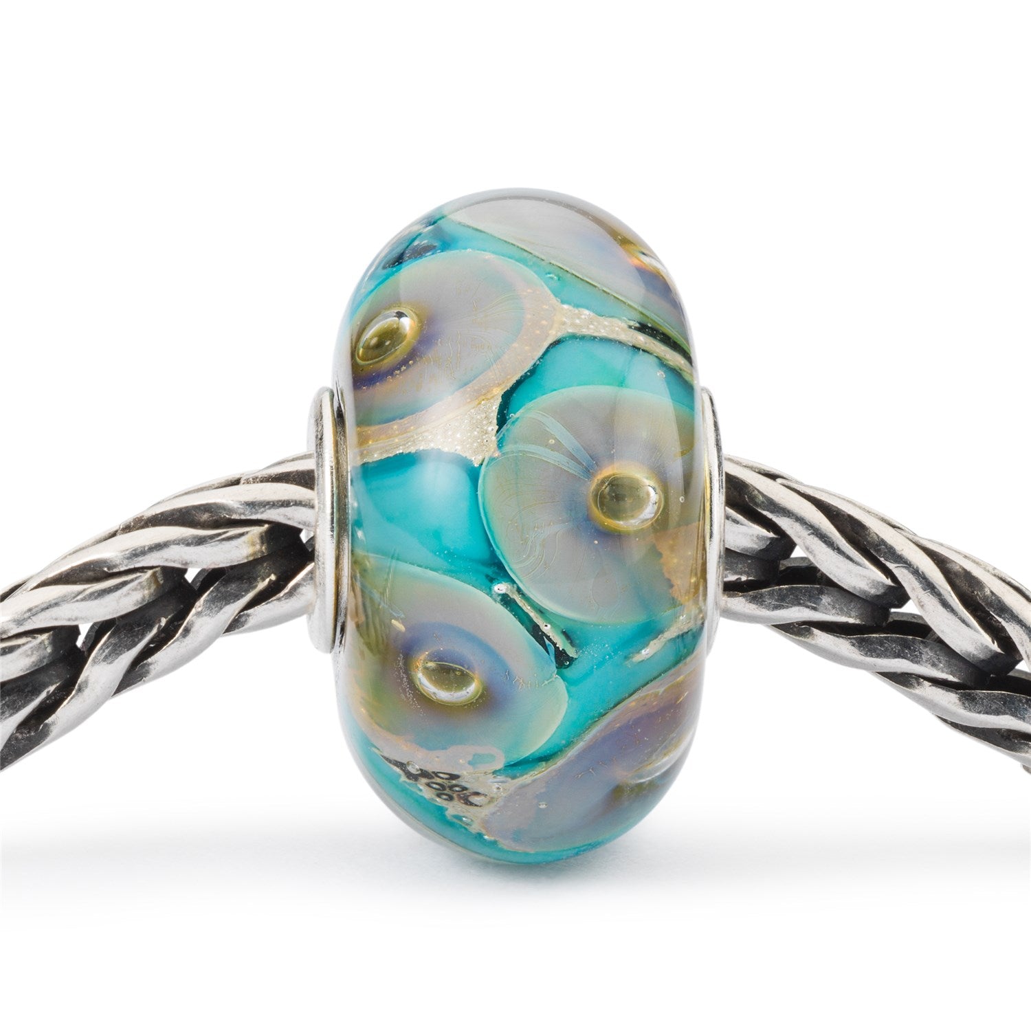 This glass bead shines pearlescent in glittering whiter and turquoise with pale white and purple flowers. In each flower, lies a candescent golden dot, like the heart of a dream azure.