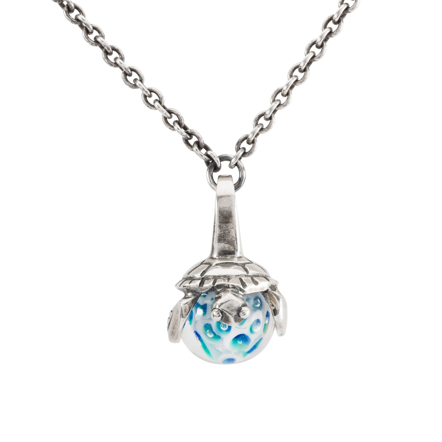 Model wearing a fantasy necklace with the pendant of calm featuring a turtle on a blue glass ball.