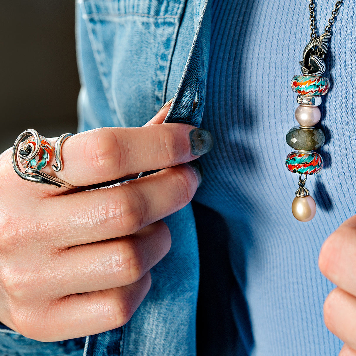 A wavy glass bead emulating the Carp Koi fish's tail in the water with turquoise and orange colors. And a detailed silver pendant of the fish wrapping it self around your bracelet or necklace chain or perhaps a bangle.