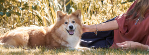 Dog and model in nature. The model is wearing Trollbeads jewellery.