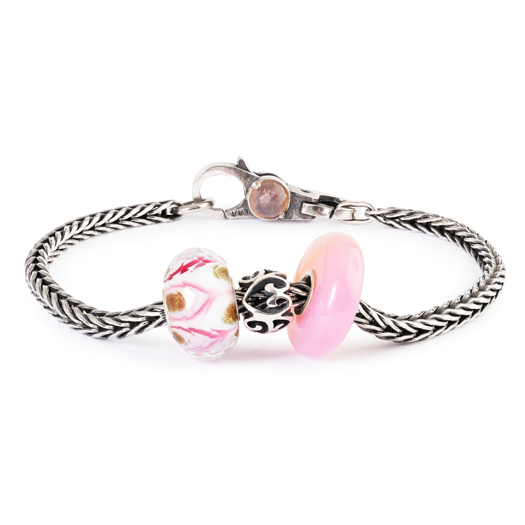 The foxtail bracelet is decorated with the Pink Symphony glass bead, the Pink Agate bead, and the From the Heart silver bead. It is fastened with the Clasp of the Heart.
