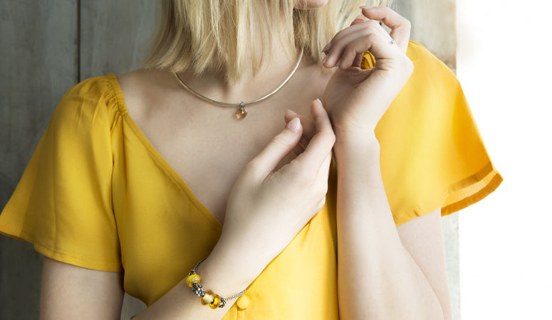 Model wearing Neck Bangle and trollbeads bracelet with beads