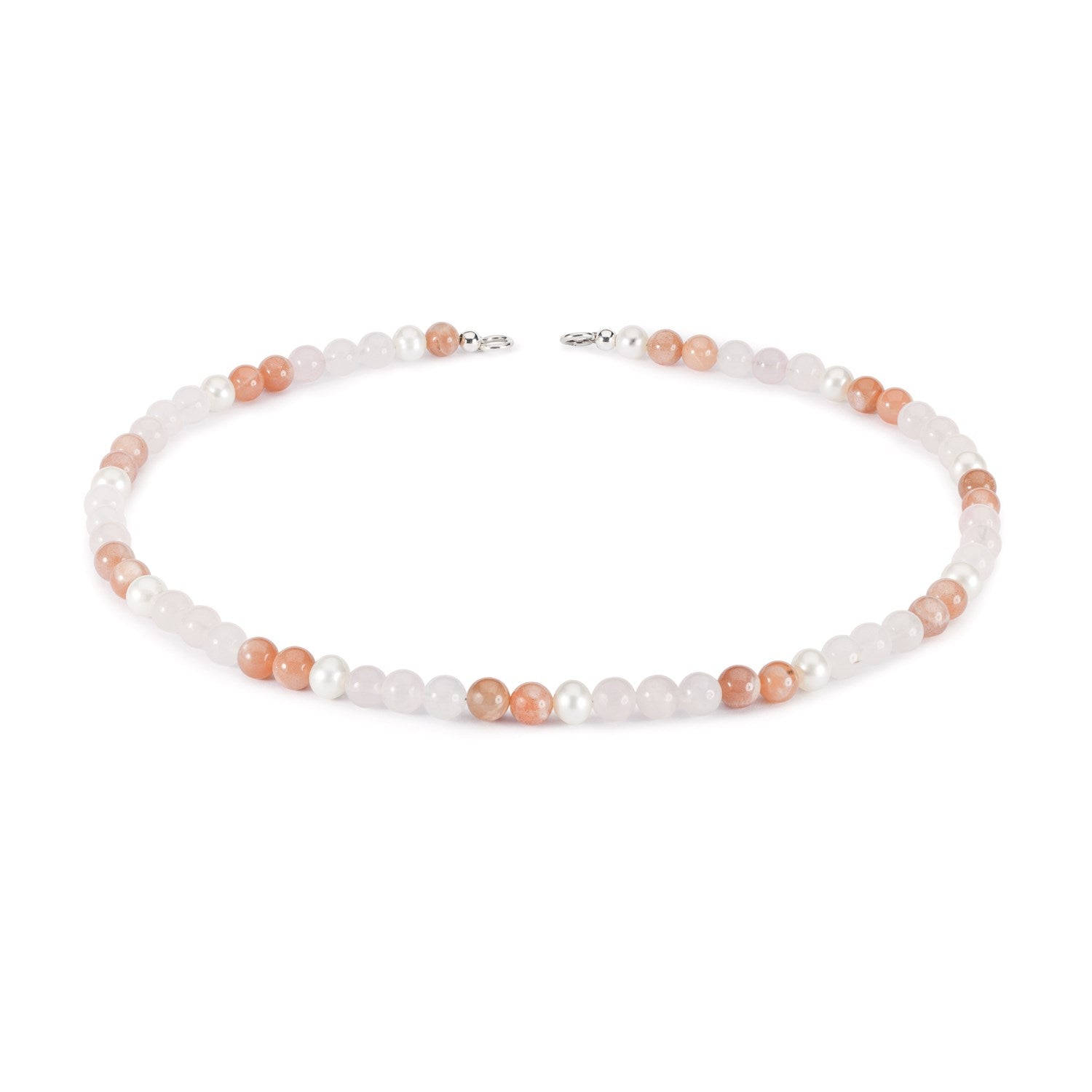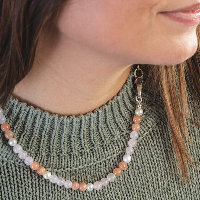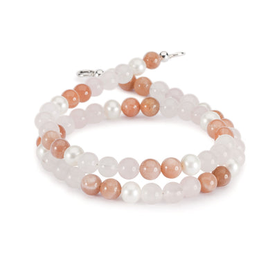 Handcrafted gemstone necklace with Rose Quartz, Feldspar Moonstone and Freshwater Pearls.