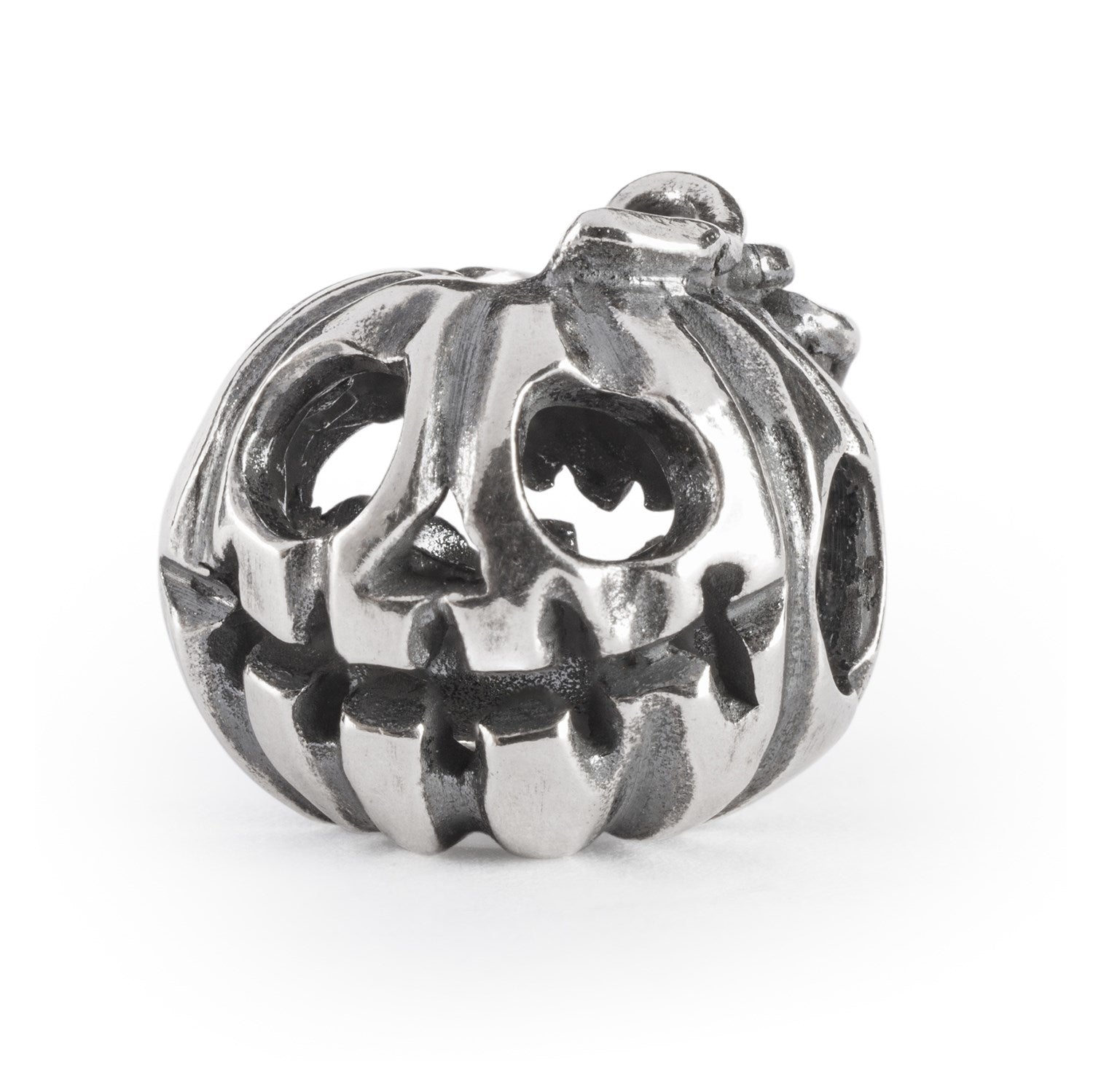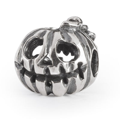 A classic pumpkin carving design in sterling silver. On front a smiling face and on the back a carved bat.