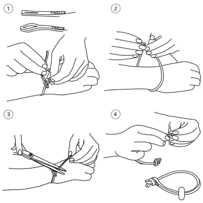 The bracelet comes in a generous length that allows for a knot to be tied at one end. The placement of the knot decides the length of the bracelet. Attach the bracelet to your wrist by slipping the knot though the loop at the other end.
