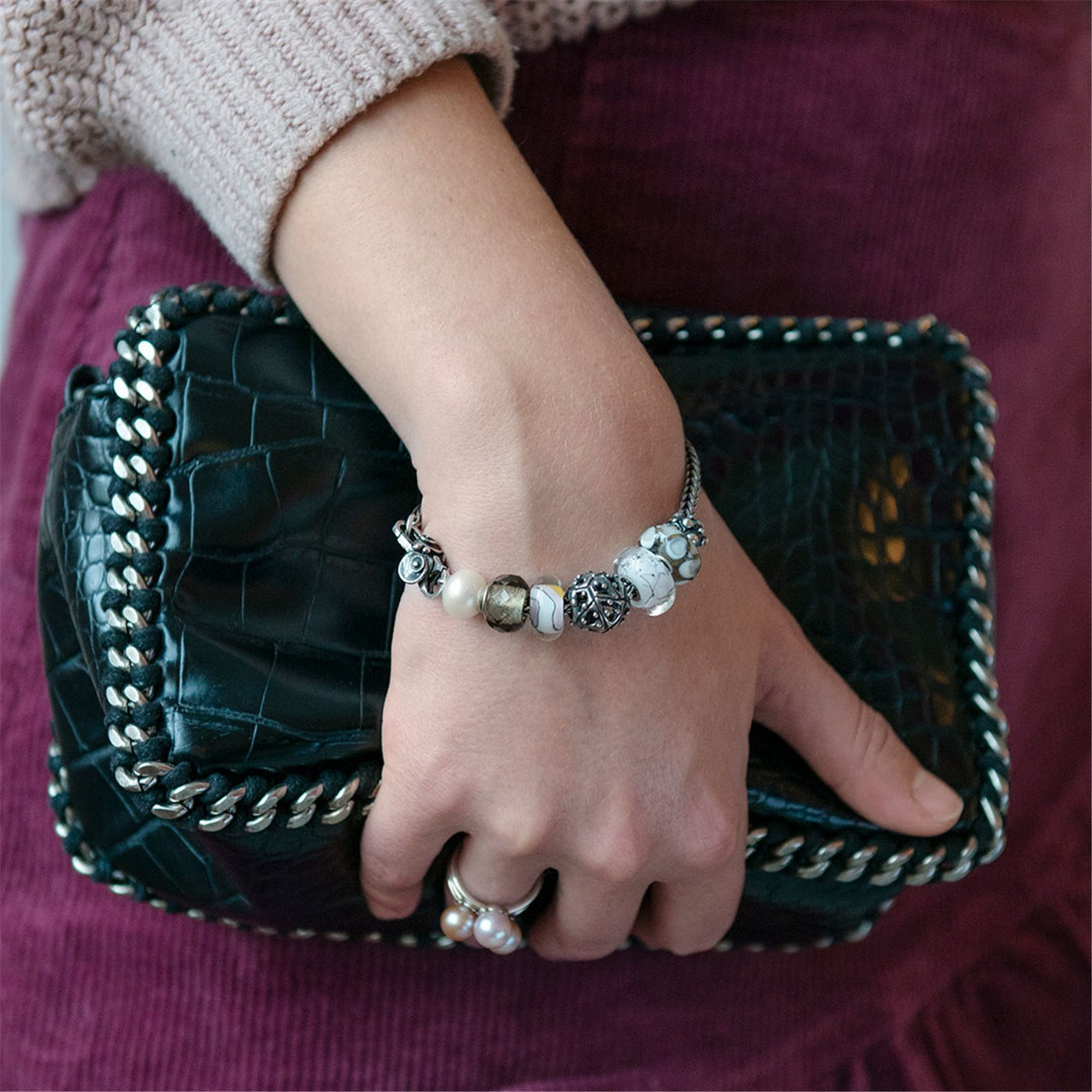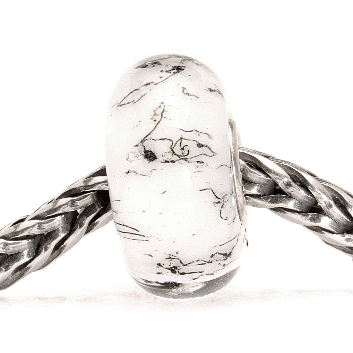 No two beads are alike. Thin threads of steel are encased in snow-white glass in this exciting and different Trollbead.